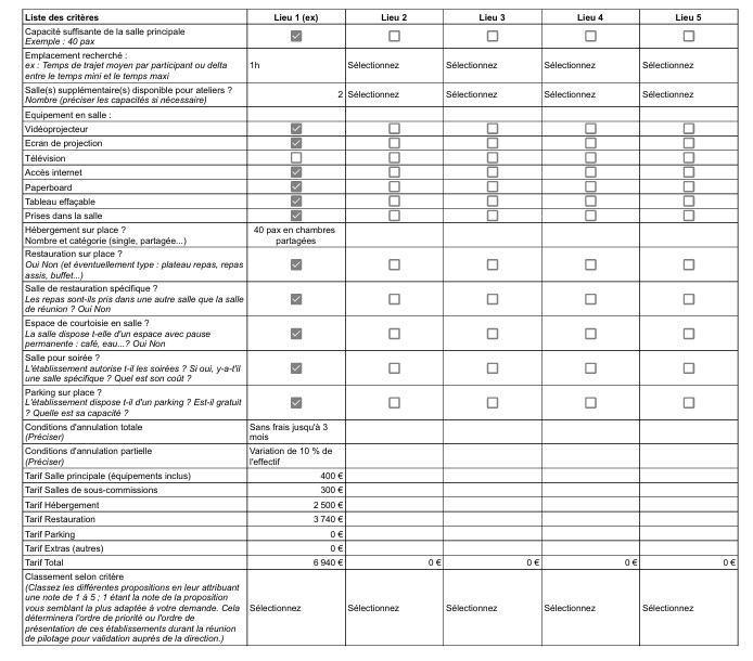 Après avoir défini les besoins organisationnels pour votre séminaire, il ne vous reste plus qu’à choisir le lieu idéal pour votre séminaire. Pour cela, nous vous proposons de réaliser un tableau comparatif afin de vous aider dans votre prise de décision. Celui-ci est personnalisable en fonction des critères que vous avez vous-même définis dans l’étape précédente.