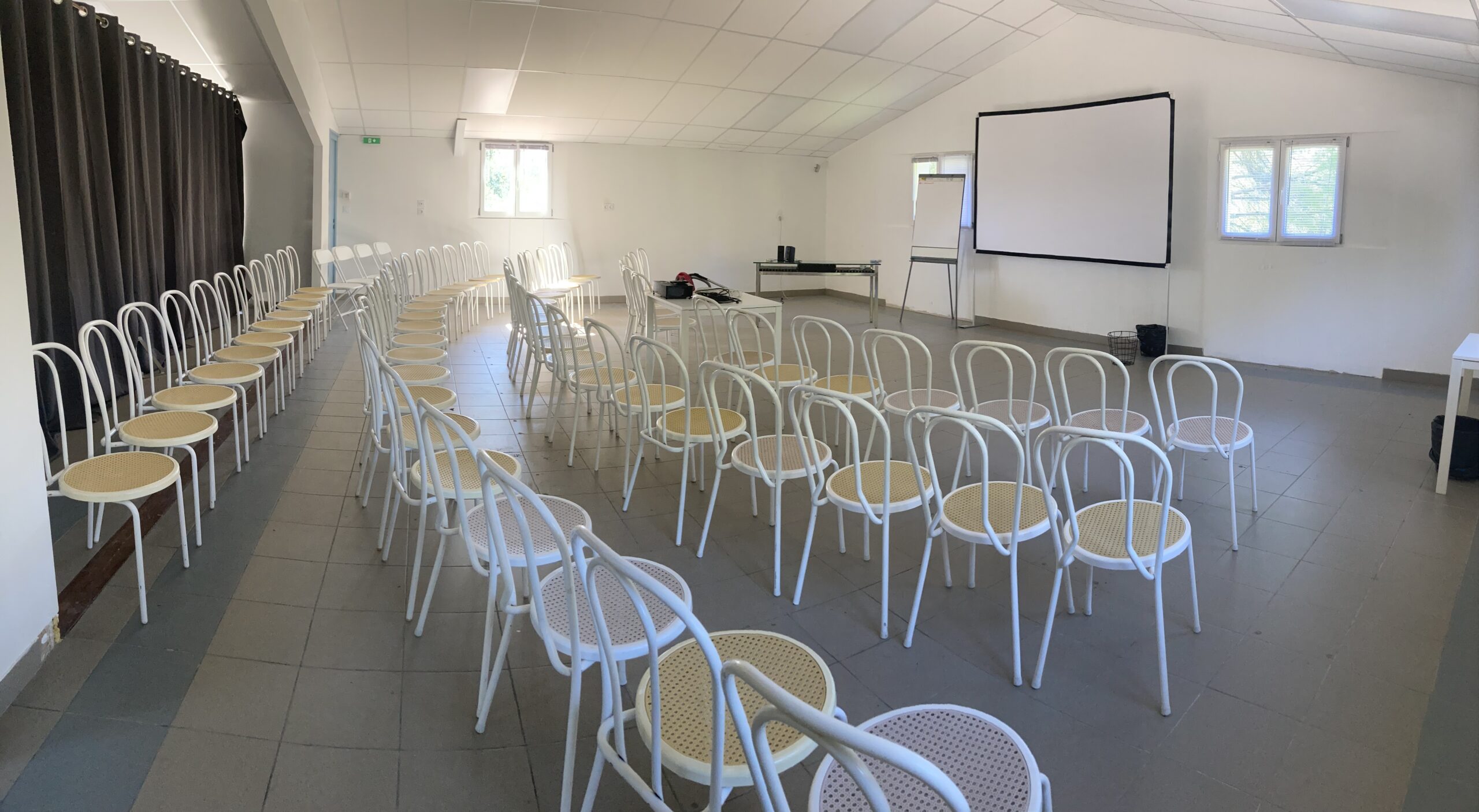 Salle de 80 m² pouvant accueillir jusqu’à 50 personnes en disposition théâtre, 30 en classe et 25 en U